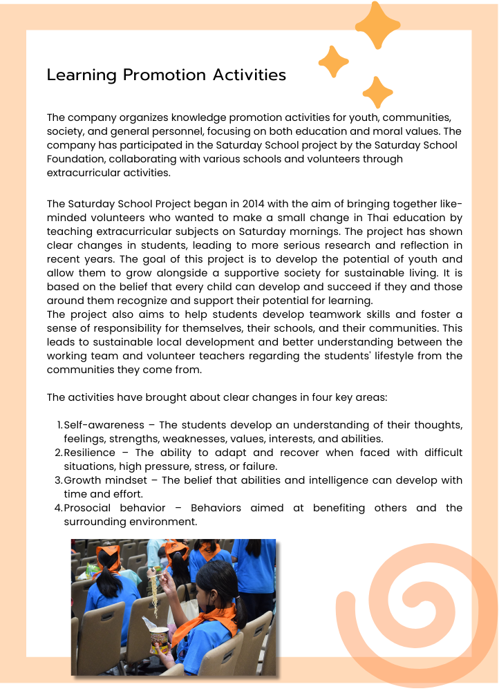 The company fosters employee engagement through various volunteer activities, as well as implementing community empowerment initiatives by utilizing the company’s specialized knowledge and expertise. This aims to develop communities to have a better quality of life, become self-reliant sustainably, and contribute to social care and support.
