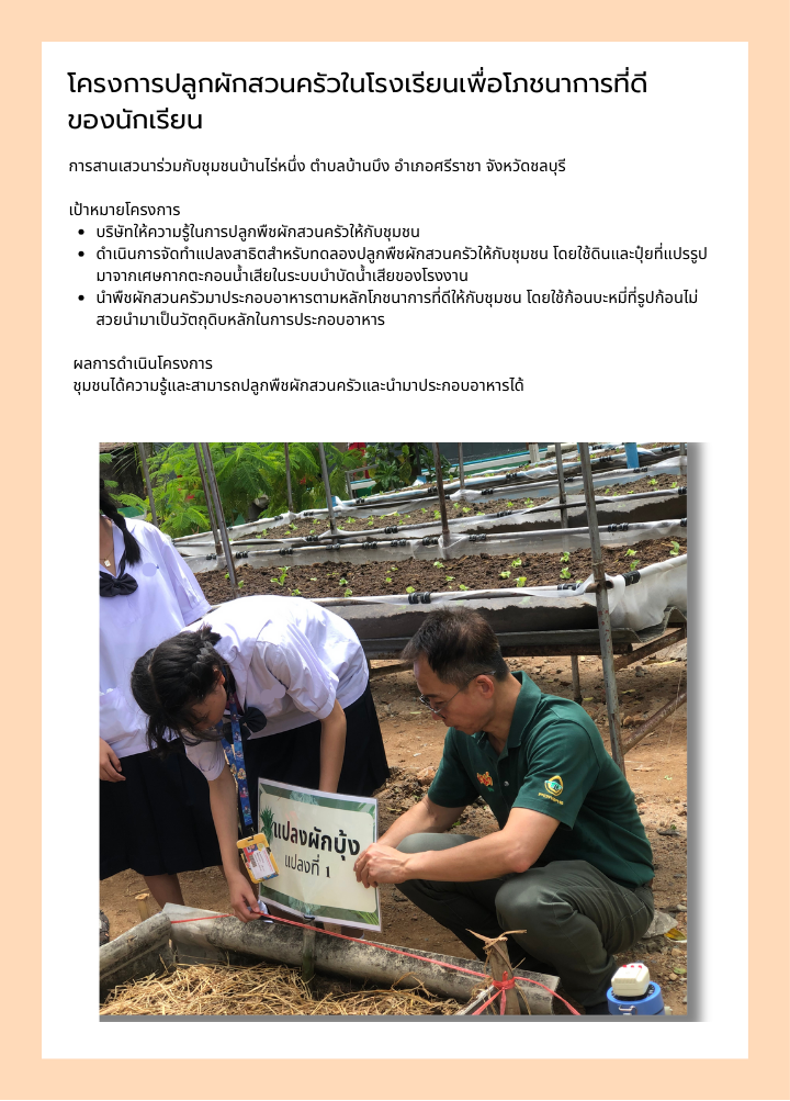บริษัทดำเนินธุรกิจควบคู่ไปกับการดูแลชุมชนและสังคม โดยส่งเสริมการมีส่วนร่วมในการพัฒนาชุมชนและสังคมที่เกี่ยวข้องกับธุรกิจเพื่อให้ชุมชนและสังคมพึ่งพาตนเองได้ การพัฒนาคุณภาพชีวิตผู้พิการและผู้ด้อยโอกาส รวมถึงการดูแลรักษาสิ่งแวดล้อมและสังคมในท้องที่ และส่งเสริมบุคลากรภายในองค์กรให้มีส่วนร่วมในการส่งมอบคุณค่าสู่ชุมชน