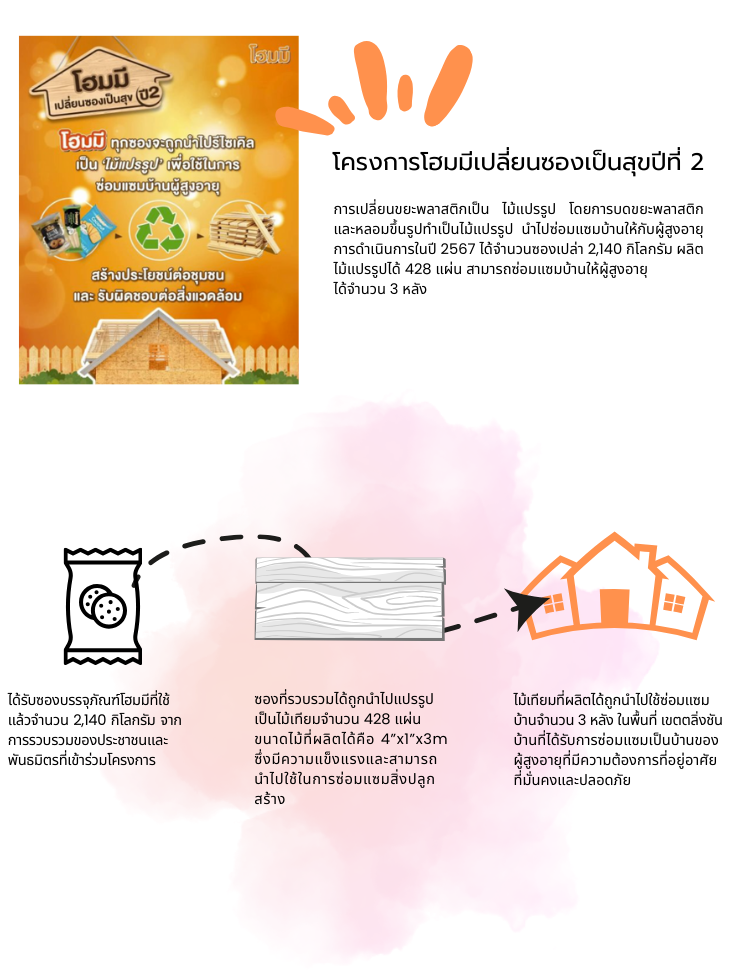 - สร้างอาชีพให้กับกลุ่มเกษตรกร โดยมีการจ้างงานเพิ่มขึ้น 2,300 คน จาก 549 ครัวเรือน เกิดการกระจายรายได้ไม่ต่ำกว่า 400,000 – 600,000 บาท/ปี